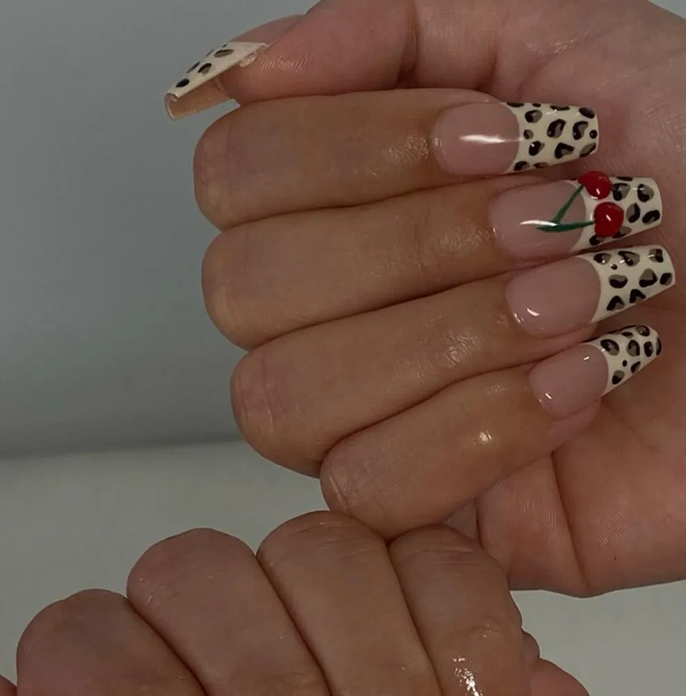 Coffin nails and French manicures are a natural pairing. This version updates the look with leopard print tips and a playful cherry accent nail.